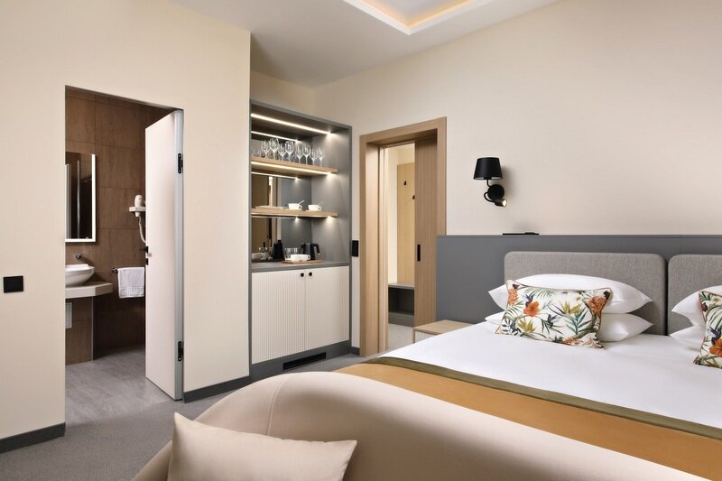 Максимальная вместимость номера: четыре человека. Размещение: большая двуспальная кровать King Size в спальне, раскладывающийся диван в гостиной позволяют с комфортом разместиться семье с детьми. Есть возможность установки детской кроватки.