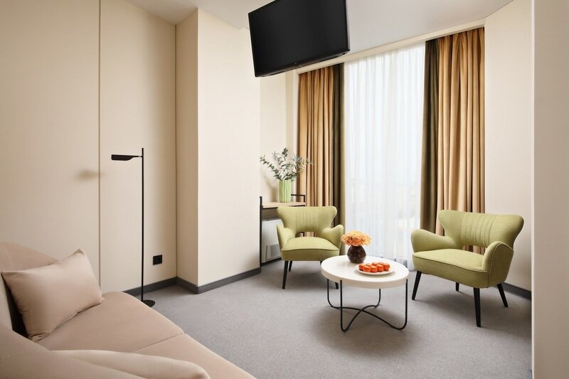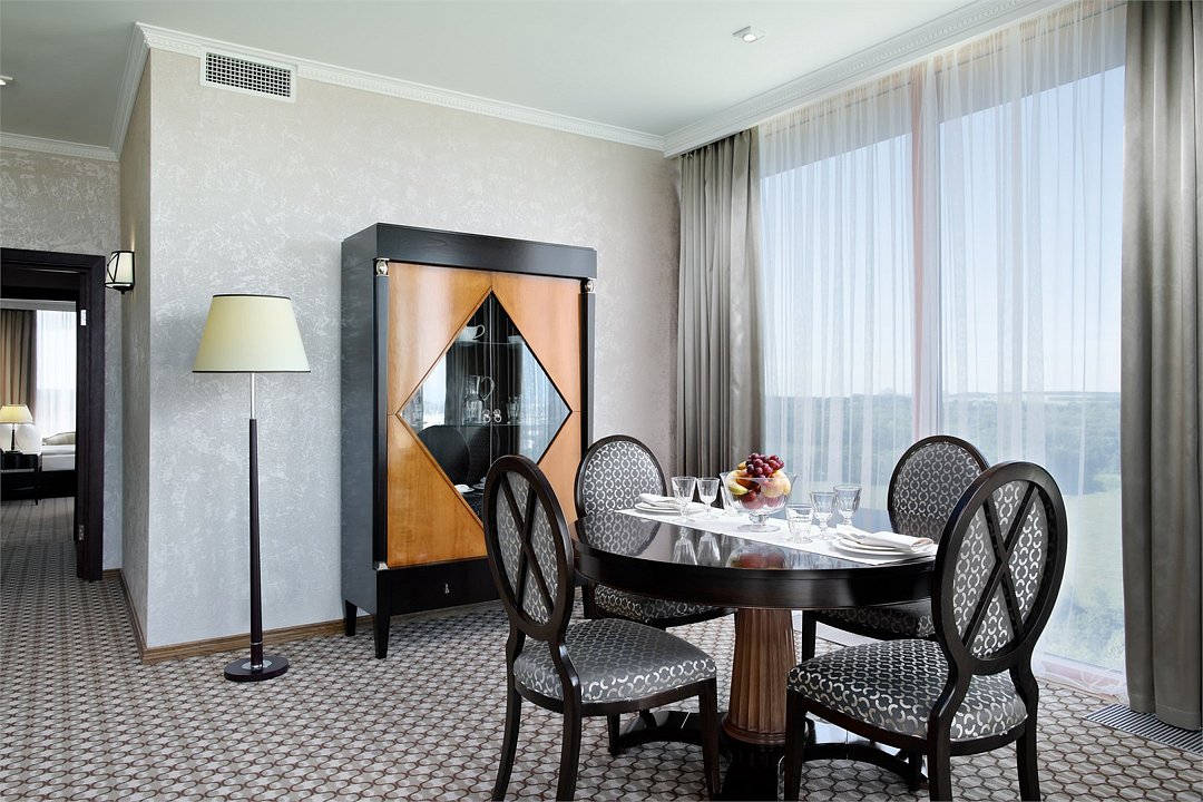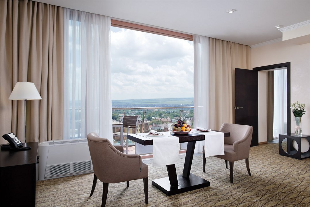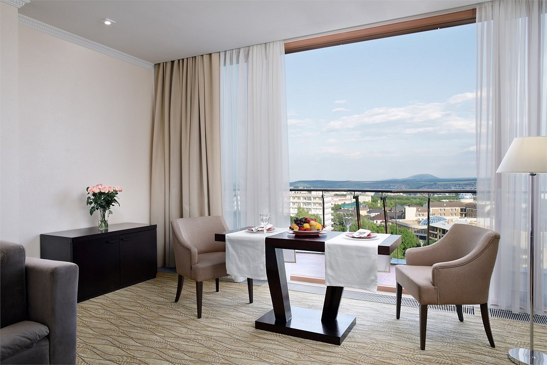Максимальная вместимость номера составляет четыре человека. Размещение: в номере имеется большая двуспальная кровать в спальне и диван-софа в гостиной. Вид из окон: через панорамные окна номера открывается восхитительный вид на две стороны: север и восток — горы-лакколиты и необъятные степи Кавказских Минеральных вод, юг и запад — Главный Кавказский хребет и самая высокая вершина Европы — Эльбрус.
