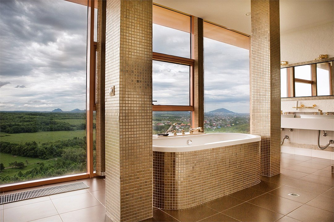 Вид из окон: из панорамных окон номера открывается потрясающий вид на две стороны: север и восток — горы-лакколиты и бескрайние степи Кавказских Минеральных вод, юг и восток — Главный Кавказский хребет и высочайшая вершина Европы — Эльбрус.